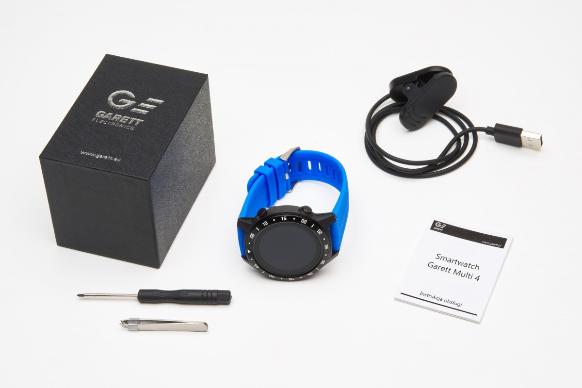 Akcesoria w zestawie: Smartwatch Garett Multi 4 Ładowarka/ kabel magnetyczny Instrukcja obsługi