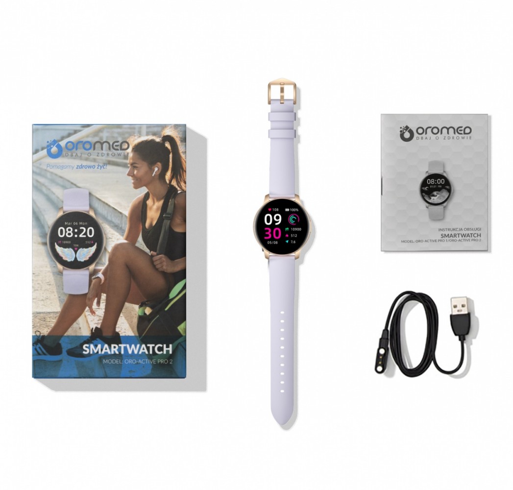 Akcesoria w zestawie: Pudełko Smartwatch ORO LADY ACTIVE_GOLD NEXT (w zależności od modelu ) Przewód magnetyczny USB do ładowania Instrukcja w języku polskim i angielskim Karta gwarancyjna producenta