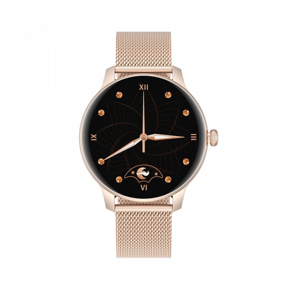 Funkcje: Krokomierz: Rejestrowanie dziennej liczby kroków, kalorii i dystansu; szczegółowe dane z historii można wyświetlić w aplikacji. Monitor tętna: Monitorowanie tętna w czasie rzeczywistym przez 24 h. Wartości dzienne i dane z historii można przeglądać w aplikacji Zawartość tlenu we krwi: Monitorowanie zawartości tlenu we krwi. Wartości dzienne i dane z historii można przeglądać w aplikacji. UWAGA: Pomiary są orientacyjne, nie służą do celów medycznych Ciśnienie krwi: Ciśnieniomierz. Wartości dzienne i dane z historii można przeglądać w aplikacji. UWAGA: Pomiary są orientacyjne, nie służą do celów medycznych Tryby sportowe: chodzenie, bieganie, jazda na rowerze, wspinaczka, joga, skakanie, badminton, rower stacjonarny, przysiady. Wartości dzienne i dane z historii można przeglądać w aplikacji. Powiadomienia: Mogą być wysyłane różne powiadomienia z telefonów komórkowych. Można zachować do 8 powiadomień. Monitor snu: Rejestrowanie czasu i jakości snu. Wartości dzienne i dane z historii można przeglądać w aplikacji Zdalne sterowanie odtwarzaniem muzyki: Zdalne sterowanie odtwarzaczem muzycznym w telefonie komórkowym, pauza/poprzedni lub następny Stoper: odmierzanie czasu Ustawienia: Regulacja jasności/ Kod QR do pobrania aplikacji/ Znajdź telefon komórkowy/ Informacje o zegarku/ Przywracanie ustawień fabrycznych/ Wyłączanie Przypomnienie o cyklu menstruacyjnym: Na stronie informacji osobistych w aplikacji należy ustawić płeć kobieta i włączyć funkcję cyklu menstruacyjnego. Dopiero wtedy ta funkcja pojawi się w menu zegarka. Zegarek będzie wyświetlać przypomnienia o dniach płodnych i niepłodnych, okresie menstruacyjnym i owulacji. POZOSTAŁE FUNKCJE Budzik, Przypomnienie o ruchu, Zdalne sterowanie kamerą, Powiadomienie o niskim poziomie baterii, Powiadomienie o połączeniu, Znajdź smartwatch, Dostosowywanie tarczy zegarka, Format czasu 12 H/24 H, Format jednostki km/mile, Ustawianie języka, Ilości spalonych kalorii, Dzienny cel długości snu, Funkcja znajdź smartwatch, Powiadomienia telefoniczne, Powiadomienia SMS, Funkcja nie przeszkadzać, Powiadomienia z aplikacji społecznościowych: Mail, Skype, Facebook Messenger, Budzik / Alarm / Stoper, Przypomnienie o spotkaniu, Przypomnienie o lekarstwach, Przypomnienie o nawodnieniu