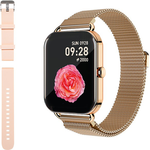 Elegancki design i wygodne użytkowanie Złota koperta i 2 wymienne paski sprawiają, że smartwatch dopasuje się do każdej stylizacji. Możesz również personalizować tarczę zegarka - do wyboru ponad 200 wzorów! Dotykowy ekran o rozdzielczości 360x360 px zapewnia wyraźny obraz i łatwość obsługi. Dzięki klasie wodoodporności IP68, smartwatch jest odporny na deszcz i zachlapania.