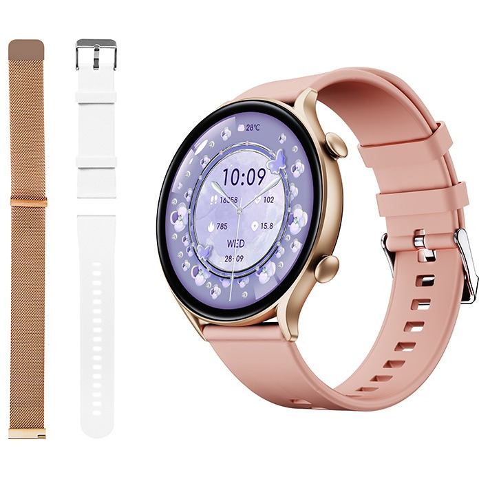 Elegancki design i wygodne użytkowanie Złota koperta i 2 wymienne paski sprawiają, że smartwatch dopasuje się do każdej stylizacji. Możesz również personalizować tarczę zegarka - do wyboru ponad 200 wzorów! Dotykowy ekran o rozdzielczości 360x360 px zapewnia wyraźny obraz i łatwość obsługi. Dzięki klasie wodoodporności IP68, smartwatch jest odporny na deszcz i zachlapania.