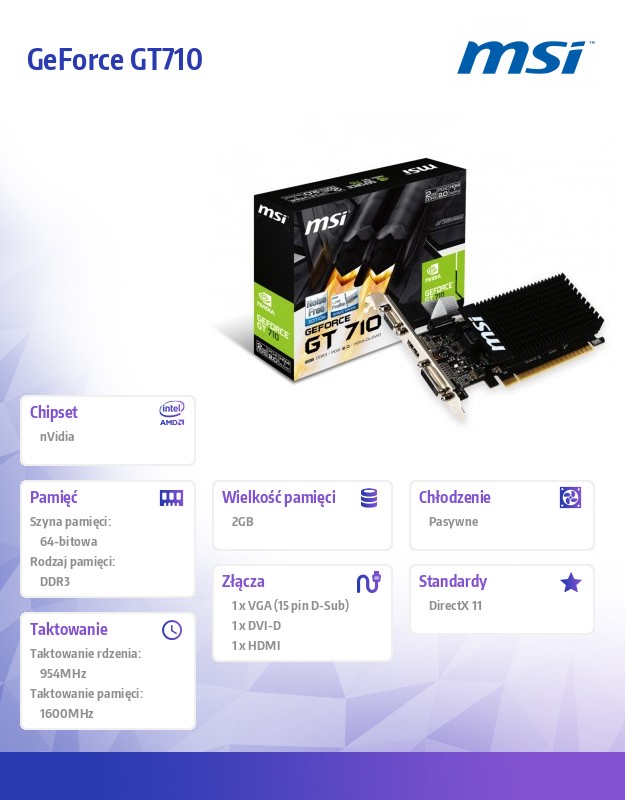 Karta graficzna GeForce GT 710 2GB DDR3 64BIT DVI/D-SUB/HDMI