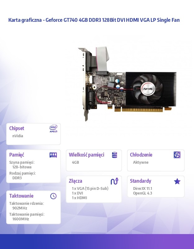 Karta graficzna Geforce GT740 4GB DDR3 128Bit DVI HDMI VGA LP Single Fan