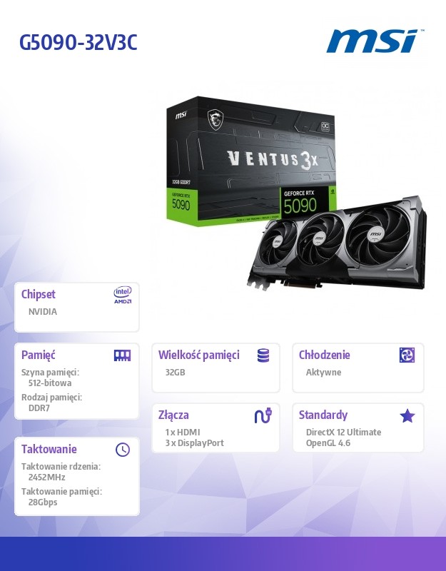 GeForce RTX 5090 32G VENTUS 3X OC Na bazie architektury NVIDIA Blackwell i technologii DLSS 4 Taktowanie rdzenia: tryb Extreme Performance: 2452 MHz (z poziomu aplikacji MSI Center);...