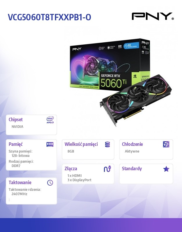 Karta graficzna PNY GEFORCE RTX 5060 Ti 8GB ARGB z podkręconym potrójnym wentylatorem i technologią DLSS 4