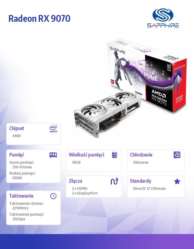 Karta graficzna Radeon RX 9070 PURE 16GB OC GDDR6 256bit 2DP/2HDMI