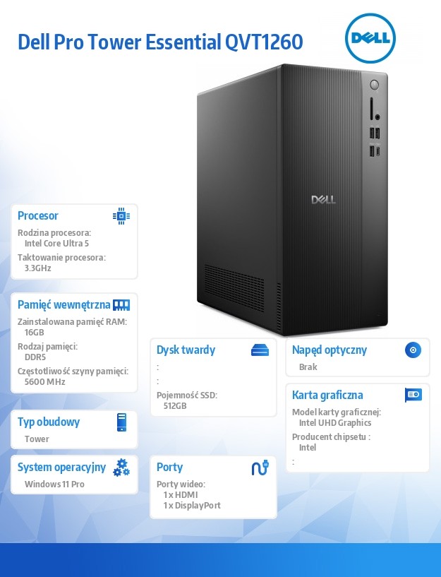 Komputer Dell Pro Tower Essential QVT1260 Win11Pro U5 225/16GB/512GB SSD/Intel UHD/WLAN+BT/Kb/Mouse/3YPS