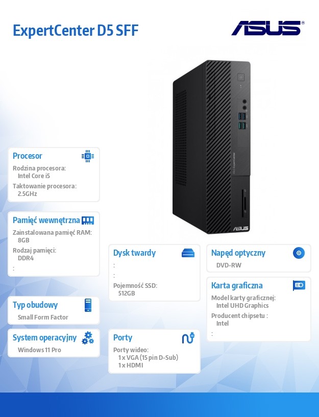 ASUS ExpertCenter D5 SFF oferuje wydajność, niezawodność i możliwość rozbudowy, zaprojektowane specjalnie z myślą o unikalnych potrzebach małych firm. Jego ultrakompaktowa, elastyczna i elegancka obudowa o małych rozmiarach pozwala użytkownikom biznesowym cieszyć się elastycznym i uporządkowanym miejscem pracy. Dodatkowo, dzięki naszym uproszczonym usługom wsparcia dla małych firm, można zredukować przestoje i obniżyć całkowity koszt posiadania.