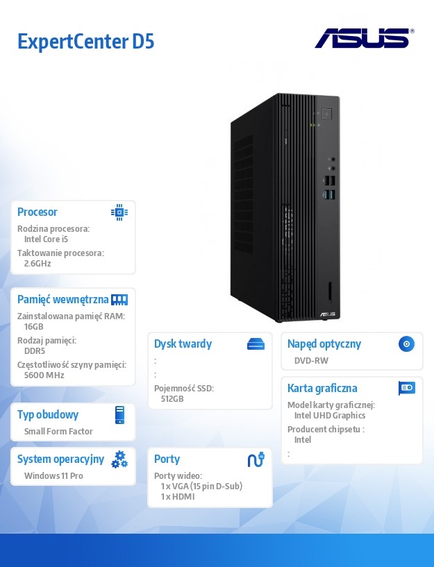 Zaprojektowany z myślą o specyficznych wymaganiach firm typu small business ASUS ExpertCenter D5 SFF to komputer desktopowy z opartą na sztucznej inteligencji funkcją Microsoft Copilot, który zapewnia potężną wydajność, godną zaufania niezawodność oraz możliwości rozszerzenia systemu. Jego nowoczesna, ultrakompaktowa i elastyczna w użytkowaniu konstrukcja nadaje się do najróżniejszych przestrzeni roboczych i scenariuszy użytkowania. Pozwala firmom korzystać z ekskluzywnych usług pomocy technicznej ASUS dla firm typu small business, nie tylko minimalizując przestoje, ale i zmniejszając całkowity koszt posiadania sprzętu, aby zmaksymalizować wartość Twojej inwestycji.