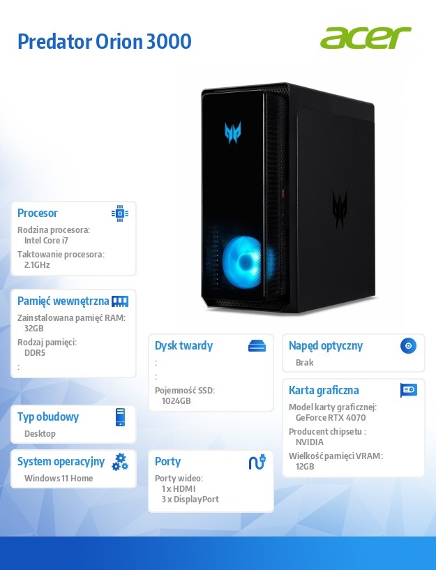 Graj, streamuj, edytuj rób wszystko z procesorem Intel Core 14. generacji i kartą GeForce RTX na zawołanie. Do tego dochodzi możliwość rozbudowy pamięci RAM, dysk SSD PCIe NVMe i mnóstwo miejsca na dodatkową pamięć masową na opcjonalnym dodatkowym dysku twardym. Możesz zbudować swoją potęge z Orion 3000.