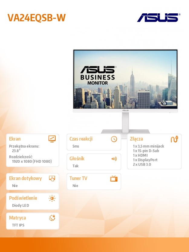 ASUS VA24EQSB-W monitor z Eye Care 23,8 cale, Full HD, IPS, bezramkowy, 75 Hz, Adaptive-Sync, Low Blue Light, Flicker Free, ergonomiczna konstrukcja, możliwość montażu ściennego 23.8-calowy monitor z matrycą IPS o rozdzielczości Full HD (1920x1080), z podświetleniem LED i szerokim kątem oglądania 178° Maksymalna częstotliwość odświeżania 75 Hz z technologią Adaptive-Sync dla wyeliminowania efektu tracingu i zagwarantowania ostrego i wyraźnego obrazu podczas odtwarzania wideo Bogate opcje połączeń, w tym gniazda HDMI, DisplayPort, D-sub i wbudowany koncentrator USB Ergonomiczna konstrukcja z możliwością dostosowania nachylenia pod kątem +35° ~ -5°, obracania w poziomie pod kątem 180°, obracania w pionie pod kątem 90° (pivot) oraz regulacji wysokości do 130 mm zapewnia komfortowe wrażenia podczas oglądania Monitory ASUS Eye Care są wyposażone w certyfikowane przez TÜV Rheinland technologie Flicker Free oraz Low Blue Light dla zapewnienia komfortu podczas użytkowania