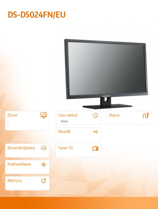 Monitor 23.8" Hikvision, technologia LED. Rozdzielczość 1920 x1080, kąty widzenia: 178st. (H) / 178st. (V). Jasność: 250 cd/m3, kontrast 1000: 1, czas reakcji: 14ms. Złącza: 1xHDMI (wej.), 1xVGA (wej.). Mocownanie VESA. Przystosowany do pracy 7x24. Wymiary: 540x418x227mm, waga około 3.43 kg. Zasilanie 230V AC