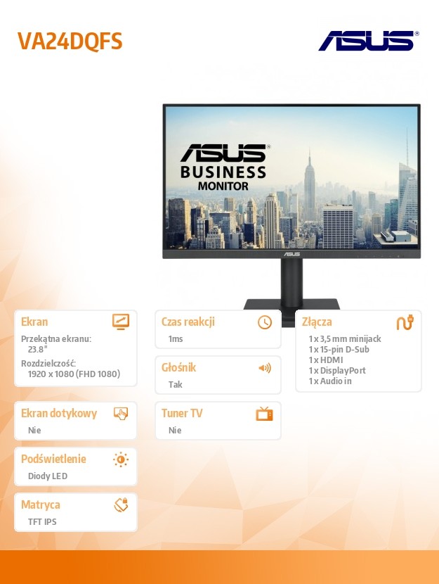 ASUS VA24DQFS - monitor do zastosowań biznesowych - 24-calowy (widoczna powierzchnia ekranu 23,8 cale), IPS, Full HD, konstrukcja bezramkowa, 100 Hz, Adaptive-Sync, 1 ms MPRT, HDMI, DisplayPort, Low Blue Light, Flicker Free, ergonomiczna konstrukcja, możliwość montażu ściennego 23,8-calowy monitor z matrycą IPS o rozdzielczości Full HD (1920 x 1080) z konstrukcją bezramkową i szerokim kątem widzenia 178°. Technologia SmoothMotion z częstotliwością odświeżania 100 Hz i czasem reakcji 1 ms MPRT zapewnia płynne wrażenia wizualne bez efektu tearingu (rozrywania klatki) poprzez aktywację funkcji VRR (zmienna częstotliwość odświeżania). Bogate możliwości połączeń obejmują HDMI i DisplayPort oraz gniazdo słuchawkowe. Możliwość montażu na ścianie za pomocą uchwytu VESA dla zaoszczędzenia miejsca na biurku. Ergonomiczna konstrukcja z możliwością dostosowania nachylenia, obracania w poziomie, obracania o 90° (pivot) oraz regulacji wysokości, zapewnia pełen komfort użytkowania. ASUS DisplayWidget Center umożliwia użytkownikom łatwą zmianę ustawień monitora za pomocą intuicyjnego interfejsu. Monitory ASUS Eye Care są wyposażone w certyfikowane przez TÜV Rheinland technologie Flicker Free oraz Low Blue Light, dla zapewnienia komfortu podczas użytkowania.