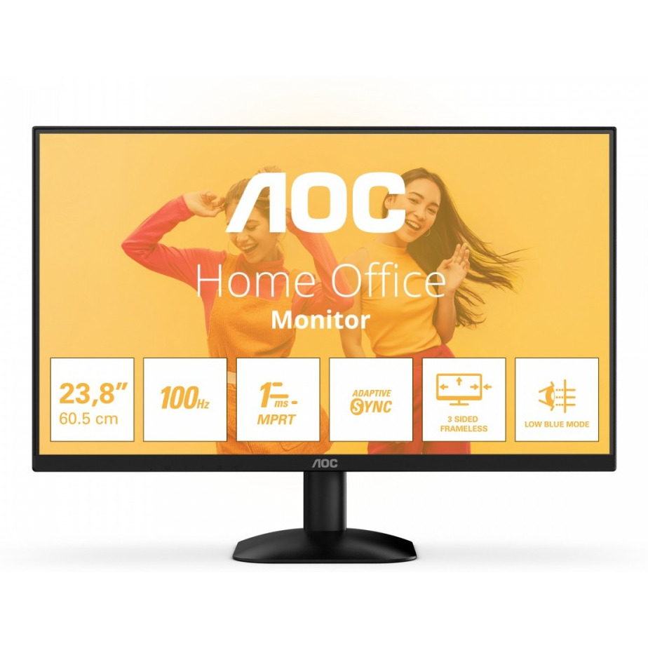 Monitor AOC 24B35HM2 jest wyposażony w 24-calowy wyświetlacz Full HD z częstotliwością odświeżania 100 Hz, czasem reakcji MPRT 1 ms i technologią Adaptive Sync, co zapewnia płynny i dynamiczny obraz. Ciesz się komfortem dla oczu i wciągającymi wrażeniami wizualnymi dzięki technologii ograniczającej emisję niebieskiego światła, technologii zapobiegającej migotaniu i konstrukcji bezramkowej z 3 stron.