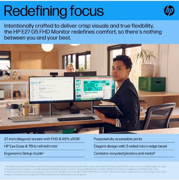 Monitor HP E27 G5 FHD został celowo zaprojektowany w taki sposób, aby zapewnić ostry obraz, spersonalizowany komfort i prawdziwą elastyczność. Ten stylowy, zaprojektowany z myślą o planecie monitor doskonale nadaje się zarówno do biura, jak i do domu.