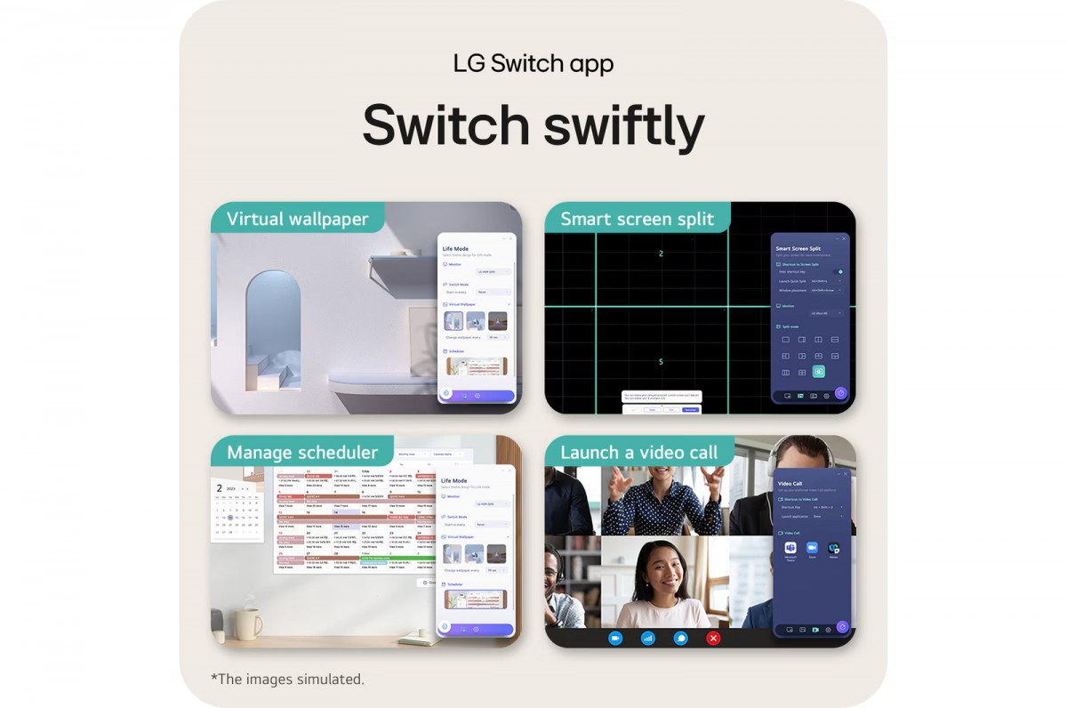 Aplikacja LG Switch pomaga zoptymalizować monitor do pracy i życia. Możesz łatwo podzielić cały wyświetlacz na 6 części, zmienić motyw, a nawet uruchomić platformę do połączeń wideo za pomocą zmapowanego klawisza skrótu.
