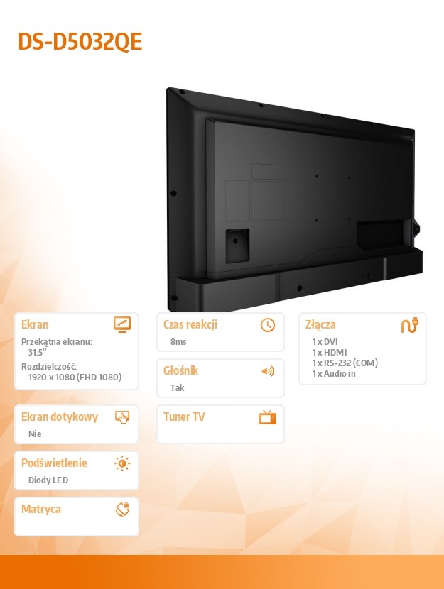 Profesjonalne wyświetlacze marki Hikvision zostały zaprojektowane do pracy w systemach monitoringowych lecz świetnie sprawdzają się również w biurze jak i w domu. Monitor DS-D5032QE umożliwia wyświetlanie zarówno statycznych, jak i dynamicznych, panoramicznych obrazów z automatycznym zachowaniem prawidłowych wartości jasności, kontrastu i naturalności w odwzorowaniu barw. Zastosowane w urządzeniu nowoczesne funkcje korekty obrazu zapewnią wielogodzinne wyświetlanie treści oraz naprzemienne prezentowanie zróżnicowanych materiałów wideo. Rozdzielczość 1920 x 1080 Przekątna ekranu 31.5 Matryca LED Backlight
