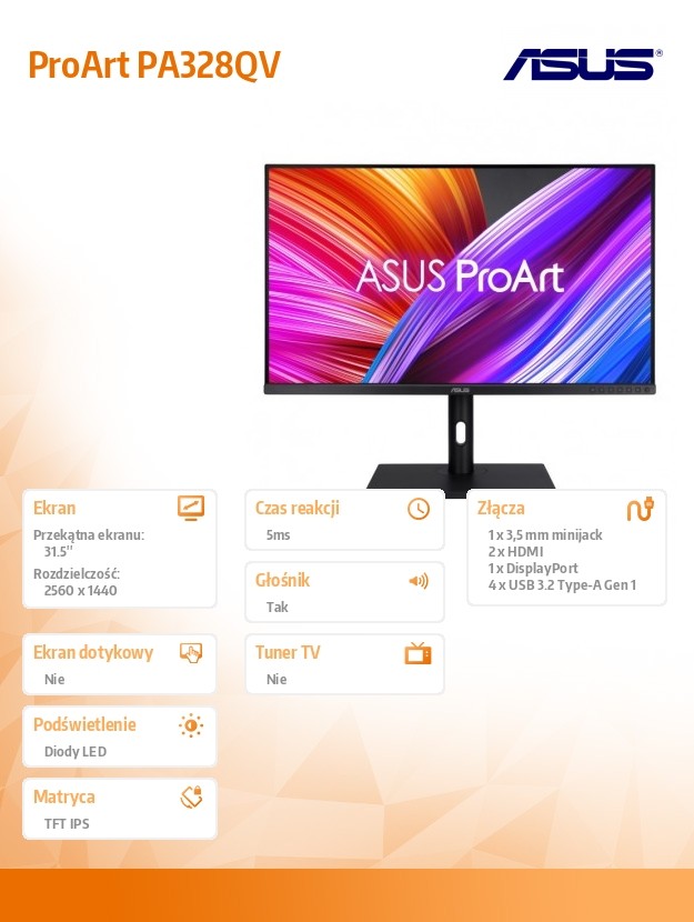 Monitor 32 cale PA328QV WQHD IPS 400cd/m2 DP HDMI2.0x2 DP USBx4 sRGB100% GŁOŚNIK PIVOT