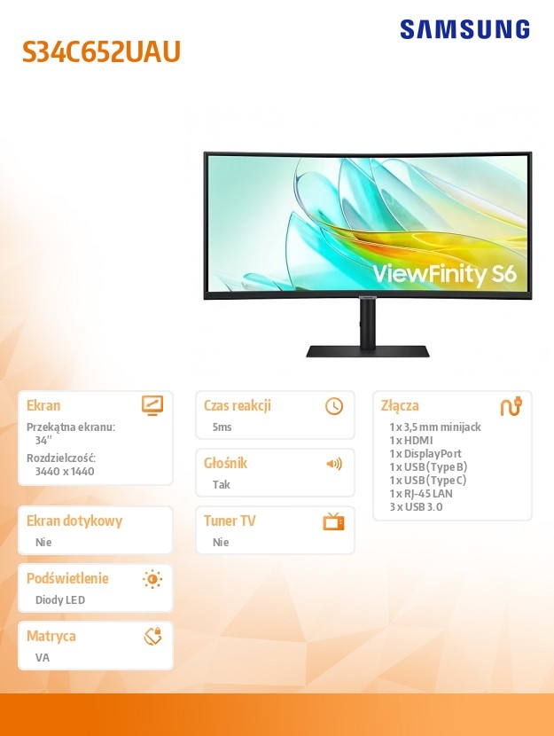 Monitor 34 cale ViewFinity S65UA VA 3440x1440 UWQHD 21:9 1xHDMI 1xDP 1xUSB-C(90W) 3xUSB 3.0 LAN (RJ45) 5ms 100Hz HAS+PIVOT zakrzywiony głośniki 3Y OS