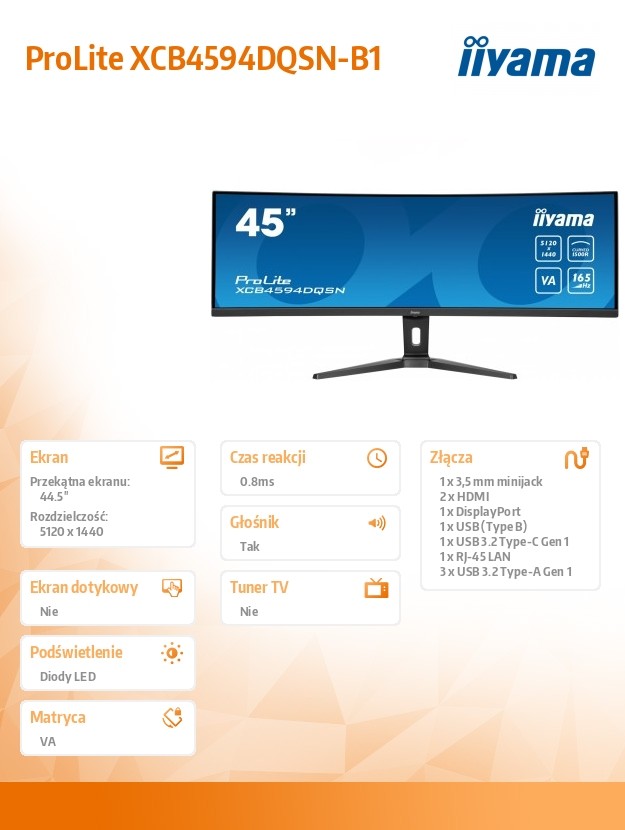 Monitor 44.5 cala XCB4594DQSN-B1 VA,DQHD,165HZ,USB-C-DOCK,RJ45,32:9,1500R,450cd/m2,3000:1,0.8ms,3xUSB,2xHDMI,1xDP,2x3W,PowerDelivery-90W