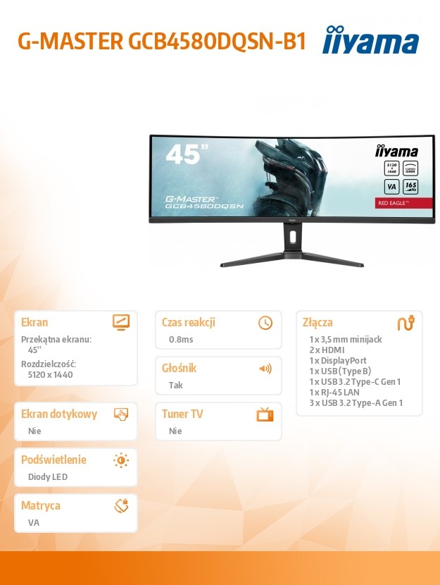 Monitor 45 cali G-Master GCB4580DQSN-B1, VA,DQHD,165HZ,USB-C-DOCK,RJ45,32:9, 1500R,450cd/m2,3000:1,0.8ms,3xUSB,2xHDMI,1xDP,2x3W,PowerDelivery-90W
