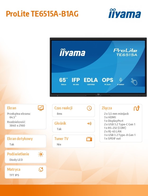 Elegancja i funkcjonalność spotykają się w modelu ProLite TE6515A-B1AG, należącym do serii TE15A marki iiyama. Ten 65" panel 4K UHD to połączenie wysokiej precyzji, wydajności oraz nowoczesnego wyglądu, który podnosi standard każdej sali lekcyjnej czy konferencyjnej.