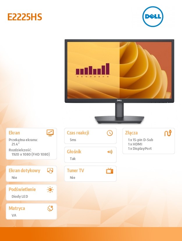Monitor E2225HS 21.4 cala LED VA FHD/(1920x1080)/16:9/DP/HDMI/VGA/Głośniki/3Y