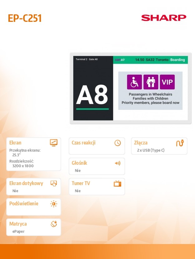 Korzyści Zerowe zużycie energii wyświetlanie obrazów statycznych nie wiąże się z poborem prądu; energia elektryczna wymagana jest jedynie do zmiany prezentowanej treści. Czytelność bez zakłóceń nawet przy silnym naświetleniu urządzenie prezentuje obraz statyczny w sposób zbliżony do papieru, bez odbić. Znakomita jakość obrazu kolory w jakości ACeP, doskonały kontrast, szerokie kąty widzenia oraz wysoka rozdzielczość zapewniają ergonomiczne wyświetlanie treści. Łatwość zarządzania treścią bezproblemowa i wygodna konfiguracja i dystrybucja treści za pomocą komputera, pendrivea, Wi-Fi lub technologii bluetooth. Szybka i elastyczna instalacja brak konieczności użycia kabla zasilającego; obsługa trybów poziomego, pionowego oraz wymagającego patrzenia w górę lub w dół.