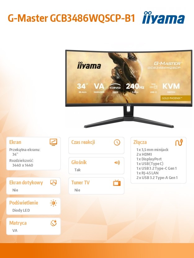 Monitor G-Master 34 cale GCB3486WQSCP-B1,VA,UWQHD,240HZ,0.4ms,1500R,HDR400,500cd,21:9,HDMI (2.1), USB-C dock 95W, RJ45, 2x5W, KVM,PiP