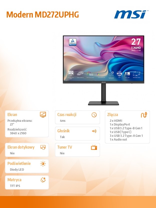 Modern MD272UPHG 27-calowy panel 4K UHD (3840 x 2160 / 16:9) zaprojektowany z myślą o biznesowych profesjonalistach, osobach pracujących wielozadaniowo i twórcach. 97%...