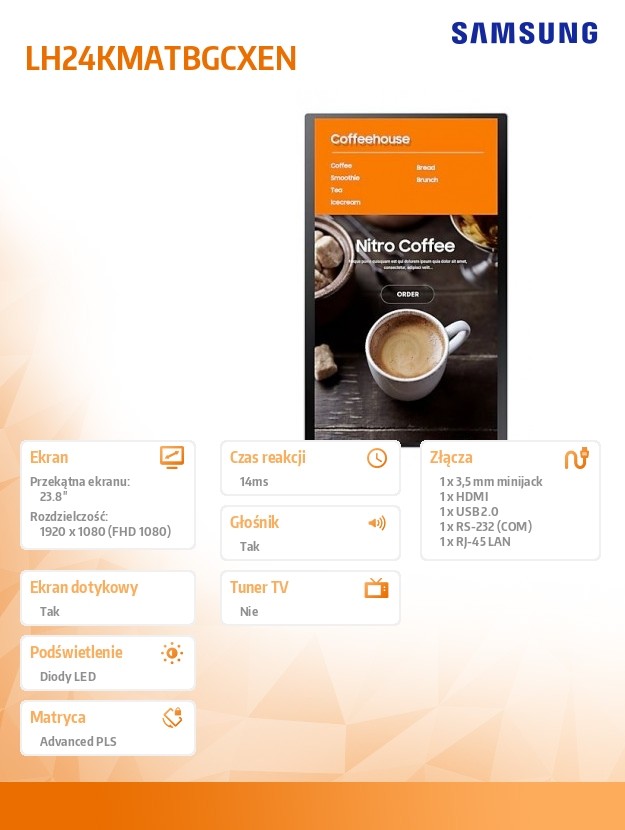 Monitor profesjonalny KIOSK KM24A/Tizen 24 cale Matowy, Dotykowa 16h/7 250(cd/m2) 1920x1080(FHD) S6 Player 3 lata d2d (LH24KMATBGCXEN)