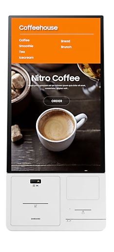 Kiosk Samsung dzięki modułowym designie, umożliwia obsługę różnych rodzajów płatności w tym przy użyciu karty kredytowej, kodu kreskowego, kodu QR i NFC wyposażony jest również w drukarkę. Jest to kompleksowe, zaawansowane rozwiązanie, które nie potrzebuje żadnych dodatkowych urządzeń peryferyjnych, ułatwiając jego utrzymanie.