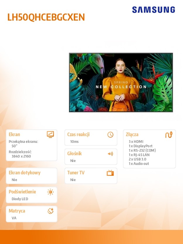 Monitor profesjonalny QH50C 50 cali Matowy 24h/7 700(cd/m2) 3840 x 2160 (UHD) S10 Player (Tizen 7) WiFi/BT 3 lata On-Site (LH50QHCEBGCXEN)