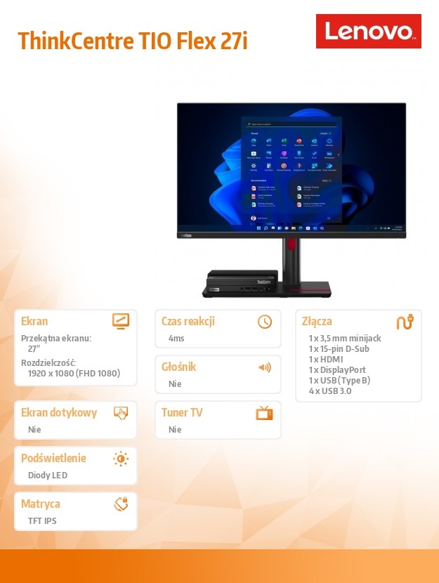 Najważniejsze funkcje: Elastyczna modułowość : To ekonomiczne rozwiązanie jest kompatybilne z przeszłymi, obecnymi i przyszłymi komputerami Tiny PC i jest wyposażone w jeden z czterech niesamowitych monitorów Lenovo ThinkVision z serii T Doskonałe wrażenia użytkownika : Przyjazny dla oczu wyświetlacz z naturalnym światłem o niskim poziomie niebieskiego światła; Prostota i czystość : Jednoetapowa instalacja z Tiny z połączeniem kablowym dwa w jednym, plątanina kabli to już przeszłość.
