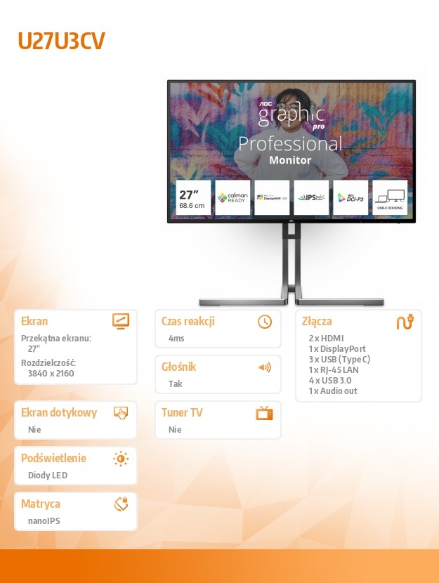 Monitor U27U3CV 27 cali 4K Nano IPS HDMIx2 DP USB-C RJ45