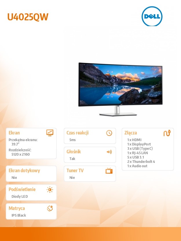 Monitor U4025QW 39,7 cala Curved/WUHD/5120x2160/21:9/HDMI/DP/Thunderbolt/USB/USB-C/Speakers/3Y PPG