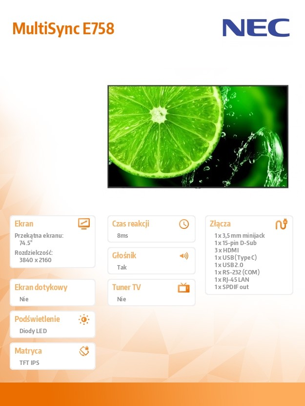 Monitor wielkoformatowy MultiSync E758 74.5 cala UHD 350cd/m2 18/7