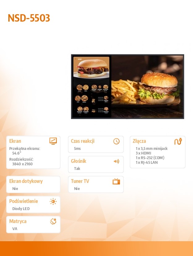 NSD-5503, 55-calowy, uniwersalny wyświetlacz Digital Signage o rozdzielczości 4K UHD, upraszcza dynamiczne dostarczanie informacji w celu skutecznego angażowania klientów....