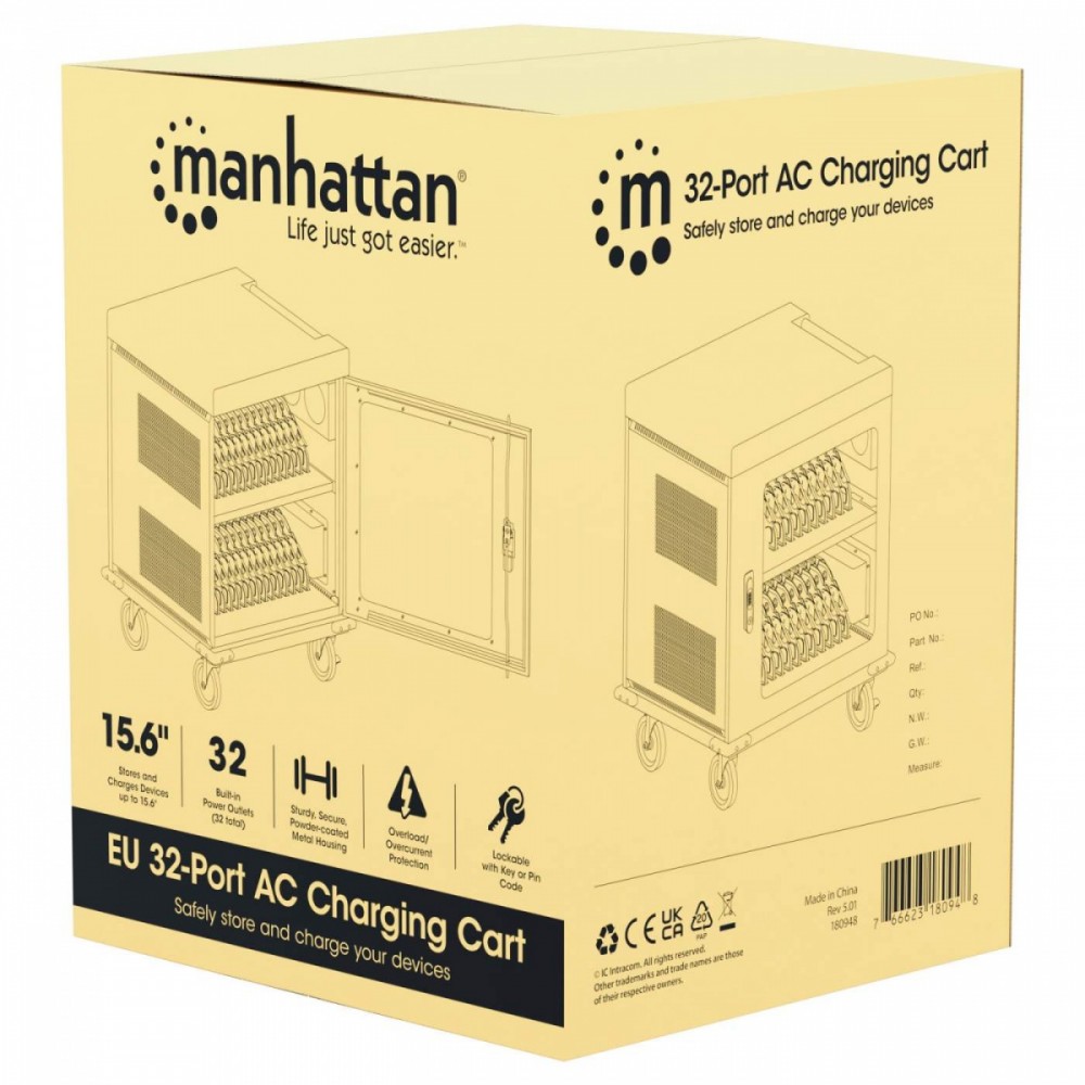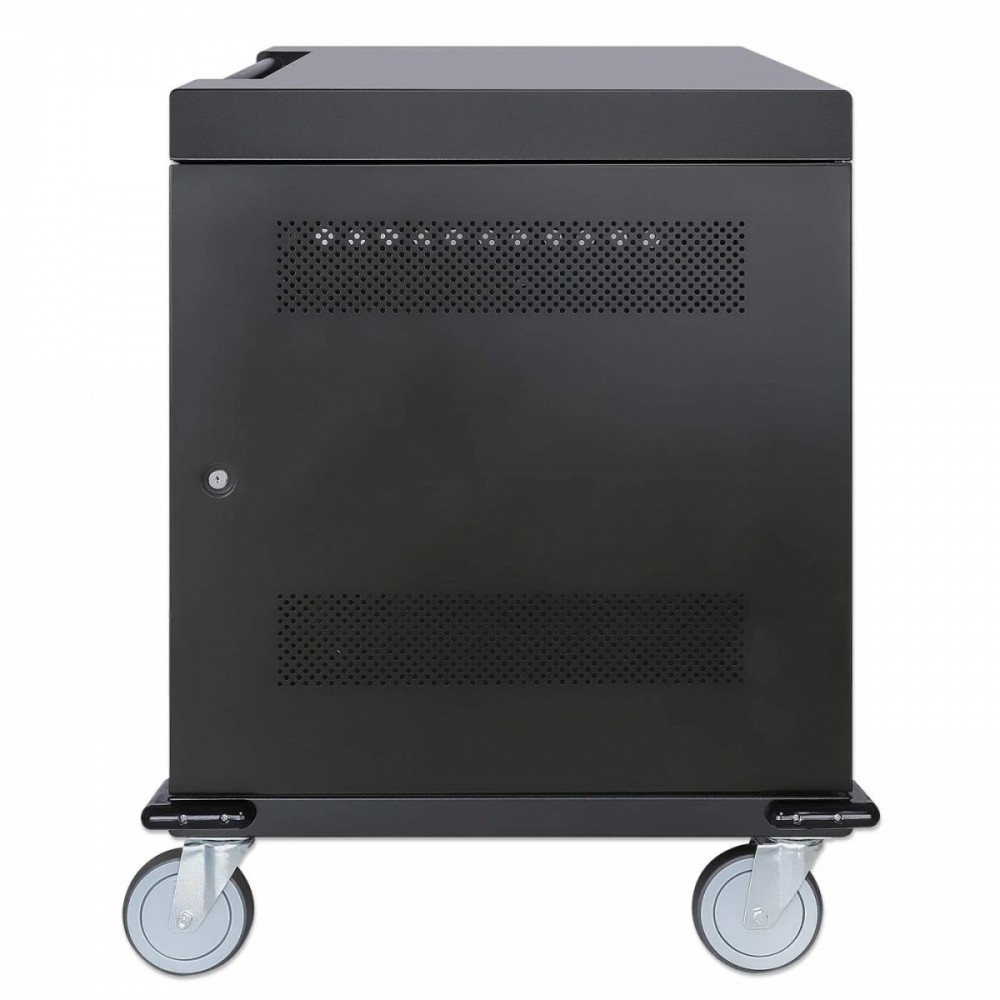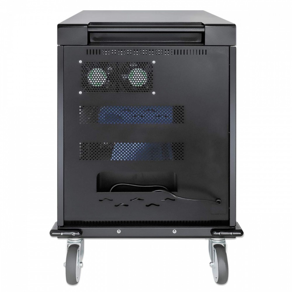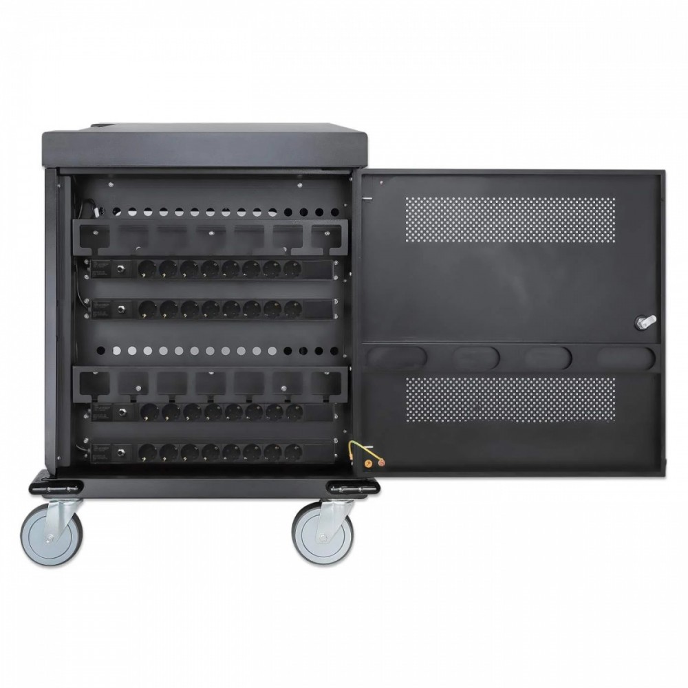 Utrzymuj urządzenia w porządku w gniazdach wnękowych, które oferują dużo miejsca (400 x 25 x 280 mm każde), nawet w przypadku dużych obudów. Wbudowane klipsy do zarządzania kablami na przegrodach wnękowych pozwalają na uporządkowanie kabli ładujących (kable USB są dostępne w sklepie Manhattan) dla lepszej organizacji i schludniejszego wyglądu. Dołączony kabel zasilający jest wyjmowany, co ułatwia przechowywanie. Bezpieczne przechowywanie i ładowanie laptopów i innych urządzeń do 15,6 cala 32 wbudowane gniazda AC EU CEE 7/3 z tyłu Inteligentny system zarządzania energią, który zapobiega przeciążeniom w dowolnym momencie Ochrona przed przeciążeniem, zwarciem i skokami napięcia Drzwi ze stali i szkła Solidna, bezpieczna obudowa z malowanego proszkowo metalu; trzypunktowy zamek drzwi z przodu i z tyłu; zamykany na dwa dołączone klucze lub czterocyfrową kombinację Przestronne gniazda na urządzenia (400 x 25 x 280 mm każde) z wbudowanym w przegrody systemem zarządzania kablami Zintegrowany wentylator i otwory wentylacyjne zapewniające maksymalny przepływ powietrza i wydajność chłodzenia Wbudowany uchwyt i cztery zdejmowane, wytrzymałe kółka Zaokrąglone krawędzie, aby uniknąć obrażeń w zatłoczonych miejscach Zestaw uziemiający w zestawie