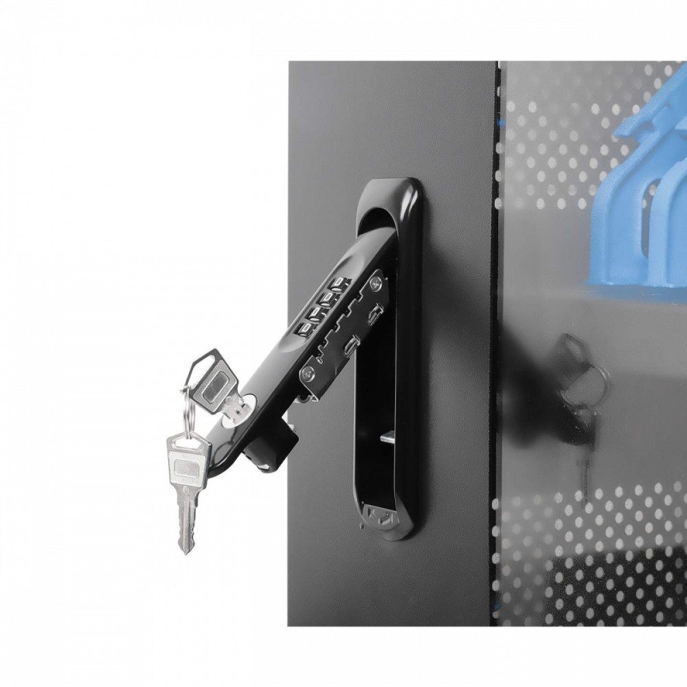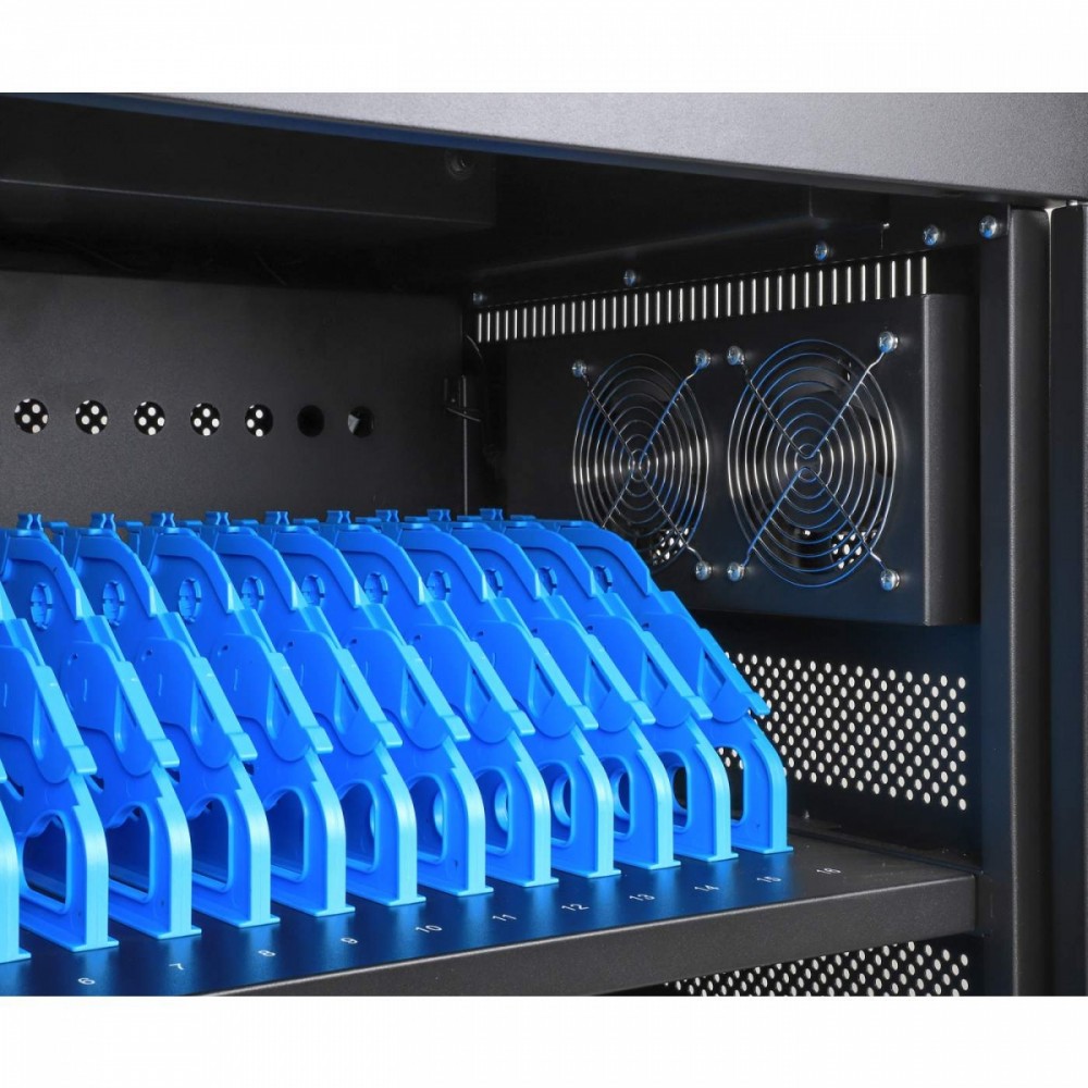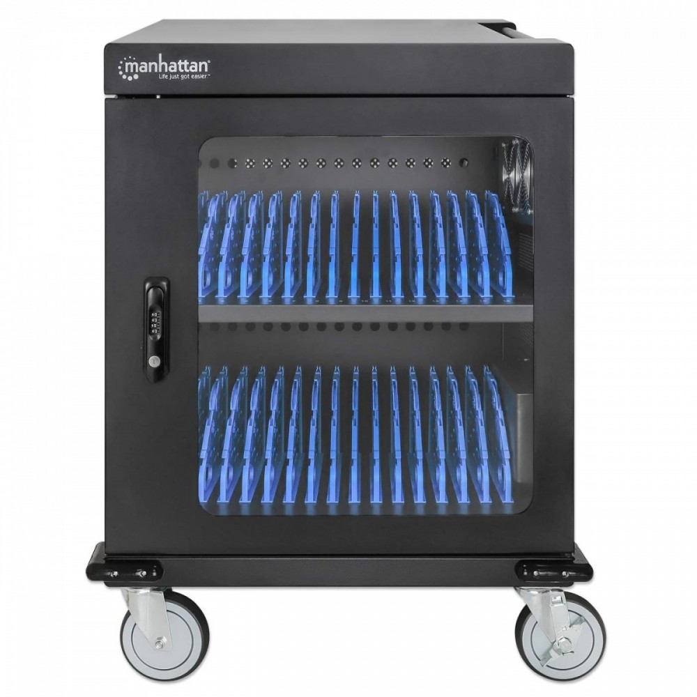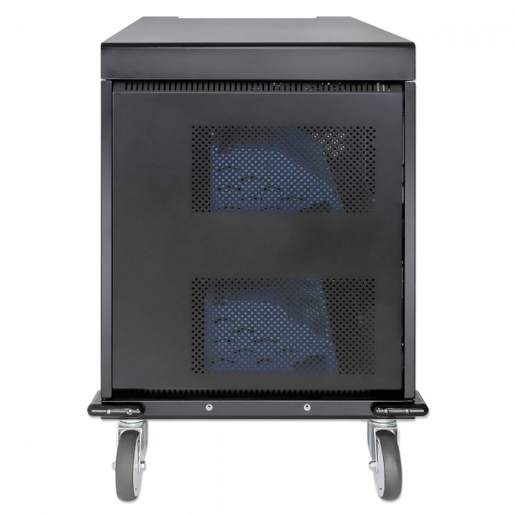 Utrzymuj urządzenia w porządku w gniazdach wnękowych, które oferują dużo miejsca (400 x 25 x 280 mm każde), nawet w przypadku dużych obudów. Wbudowane klipsy do zarządzania kablami na przegrodach wnękowych pozwalają na uporządkowanie kabli ładujących (kable USB są dostępne w sklepie Manhattan) dla lepszej organizacji i schludniejszego wyglądu. Dołączony kabel zasilający jest wyjmowany, co ułatwia przechowywanie. Bezpieczne przechowywanie i ładowanie laptopów i innych urządzeń do 15,6 cala 32 wbudowane gniazda AC EU CEE 7/3 z tyłu Inteligentny system zarządzania energią, który zapobiega przeciążeniom w dowolnym momencie Ochrona przed przeciążeniem, zwarciem i skokami napięcia Drzwi ze stali i szkła Solidna, bezpieczna obudowa z malowanego proszkowo metalu; trzypunktowy zamek drzwi z przodu i z tyłu; zamykany na dwa dołączone klucze lub czterocyfrową kombinację Przestronne gniazda na urządzenia (400 x 25 x 280 mm każde) z wbudowanym w przegrody systemem zarządzania kablami Zintegrowany wentylator i otwory wentylacyjne zapewniające maksymalny przepływ powietrza i wydajność chłodzenia Wbudowany uchwyt i cztery zdejmowane, wytrzymałe kółka Zaokrąglone krawędzie, aby uniknąć obrażeń w zatłoczonych miejscach Zestaw uziemiający w zestawie