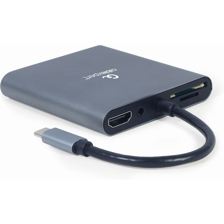 Adapter USB Typ-C 6 w 1 (Hub3.1 + HDMI + VGA + PD + czytnik kart + dźwięk stereo), szary 6 w 1: port USB3, wyjście wideo 4K HDMI i Full HD VGA, dźwięk stereo, czytnik kart i obsługa ładowania USB Type-C PD Praktyczny czytnik kart, wyjścia wideo i audio Plug & Play USB 3.1 Gen 1 (5 Gbps) port Port HDMI z obsługą UHD 4K @30 Hz Port wideo VGA Full HD Wyjście audio stereo 3,5 mm Port 60 W USB Typ-C Power Delivery 3.0 Czytnik i nagrywarka kart SD i MicroSD Wytrzymała metalowa obudowa premium