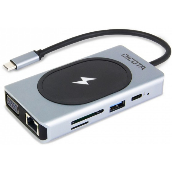 Rozszerz złącze USB swojego komputera za pomocą zintegrowanego złącza USB-C. Zintegrowany w górnej części moduł ładowania bezprzewodowego ładuje urządzenia o mocy do 15 W. Dzięki zintegrowanym portom HDMI (4K) i VGA (1080p) możesz podłączyć ten Hub do monitora o wysokiej rozdzielczości. Możesz także podłączyć słuchawki lub sprzęt audio za pomocą jednego kabla. Urządzenie oferuje również zasilanie USB-C o mocy do 100 W, które jest przeznaczone do zasilania podłączonego laptopa lub tabletu za pomocą oryginalnego zasilacza sieciowego. Port LAN RJ-45 o przepustowości do 1000Mbps umożliwia podłączenie komputerów do sieci Ethernet. Zintegrowane czytniki kart SD i microSD umożliwiają przesyłanie plików za pomocą urządzeń takich jak aparaty fotograficzne. Koncentrator DICOTA jest kompatybilny z komputerami Mac, Windows i innymi urządzeniami obsługującymi USB-C. Dzięki specyfikacji plug and play nie potrzebujesz dodatkowej konfiguracji urządzenia. Wielofunkcyjny koncentrator USB-C Połączenie HDMI z rozdzielczością do 4K Złącze VGA z rozdzielczością do 1080p 2x porty USB-A, 1x USB-C Dostarczana moc do 100W Bezprzewodowe ładowanie do 15 W Czytnik kart SD/microSD w zestawie Wtyczka combo audio/mikrofon 3,5 mm Port Ethernet RJ-45 LAN o przepustowości do 1000Mbps Krótki kabel połączeniowy USB-C (stały) Aluminiowa obudowa zapewniająca optymalną wymianę ciepła