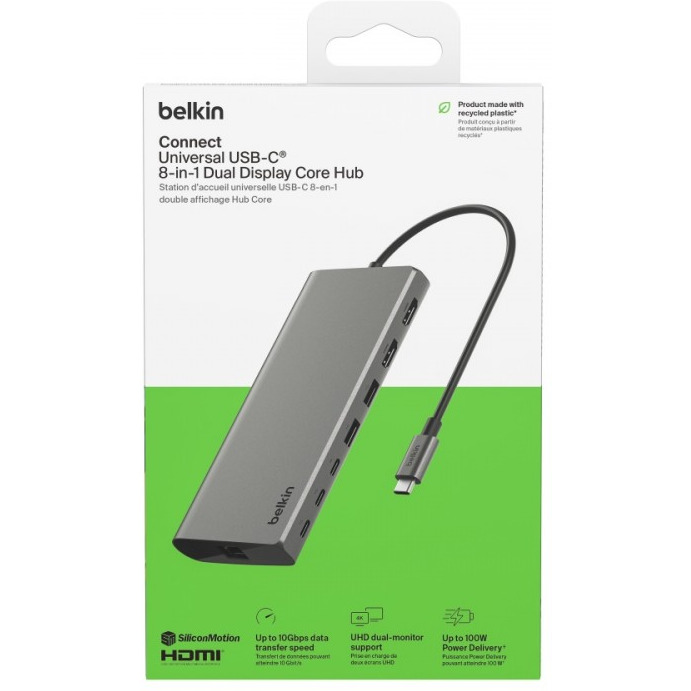 podróży. Najnowsza technologia Silicon Motion zapewnia większą moc i wydajność, oferując dostęp do wielu rozszerzonych opcji wyświetlania. Osiem dodatkowych portów za pośrednictwem jednego uniwersalnego złącza USB-C Obsługa dwóch monitorów UHD 4K 60 Hz i 4K 30 Hz Brak konieczności instalacji sterownika dzięki technologii Silicon Motion (sterownik dostępny do pobrania) Zasilanie urządzeń dzięki funkcji Power Delivery o mocy do 100 W Szybki transfer danych do 10 Gb/s, aby więcej czasu spędzać na pracy, a mniej na przesyłaniu danych Specjalny port Gigabit Ethernet Porty USB-C i USB-A Produkt objęty dwuletnią gwarancją