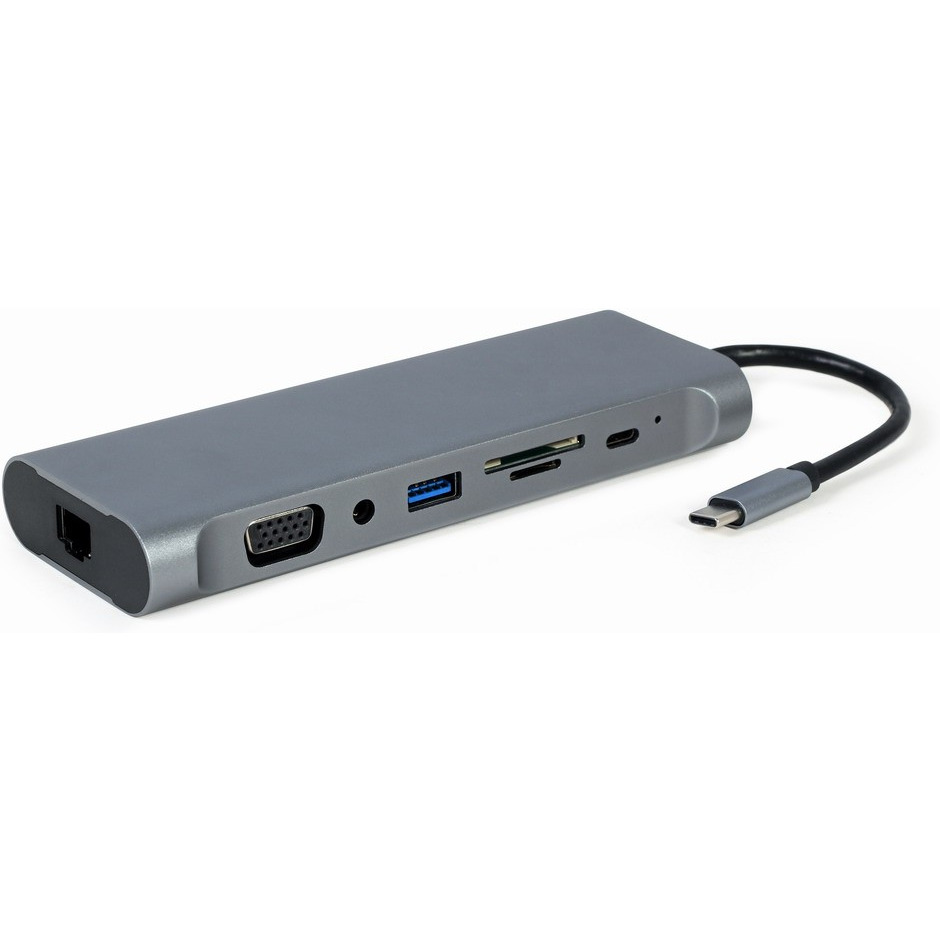 Adapter USB Typ-C 8 w 1 (Hub3.0 + HDMI + DisplayPort + VGA + PD + czytnik kart + LAN + dźwięk stereo), szary 8 w 1: koncentrator USB 3, porty wideo 4K HDMI, DisplayPort i Full HD VGA, dźwięk stereo, port Gigabit LAN, czytnik kart i obsługa ładowania USB Type-C PD Szybkie gigabitowe połączenie sieciowe i superszybki transfer danych przez hub USB 3.0 Praktyczny czytnik kart, wyjścia wideo i audio Plug & Play 4-portowy hub USB 3.1 Gen 1 (5 Gb/s) Port HDMI z obsługą UHD 4K @30 Hz Port DisplayPort z obsługą UHD 4K @30 Hz Port wideo VGA Full HD Wyjście audio stereo 3,5 mm Port 60 W USB Typ-C Power Delivery 3.0 Gigabitowy port LAN 10/100/1000 Mb/s Czytnik i nagrywarka kart SD i MicroSD Wytrzymała metalowa obudowa premium