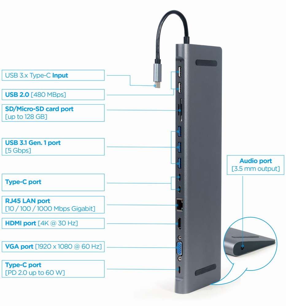 Adapter wieloportowy USB Type-C 9w1 (hub USB + HDMI + VGA + PD + czytnik kart + LAN + audio 3,5 mm), kolor szary Wszystkie potrzebne funkcje w jednym adapterze. Funkcje 9 w 1: hub USB, 4K HDMI i Full HD VGA, audio, port Gigabit LAN, czytnik kart i gniazdo ładowania USB Type-C PD Plug & Play 3-portowy hub USB 3.1 Gen 1 (5 Gb/s) 2-portowy hub USB 2 (480 Mb/s) Port HDMI z obsługą UHD 4K @30 Hz Port VGA Full HD Wyjście audio stereo 3,5 mm Gigabitowy port LAN 10/100/1000 Mb/s Czytnik/nagrywarka kart SD i Micro-SD Port USB 3.0 typu C Power Delivery o mocy 60 W Trwała metalowa obudowa w stylu premium