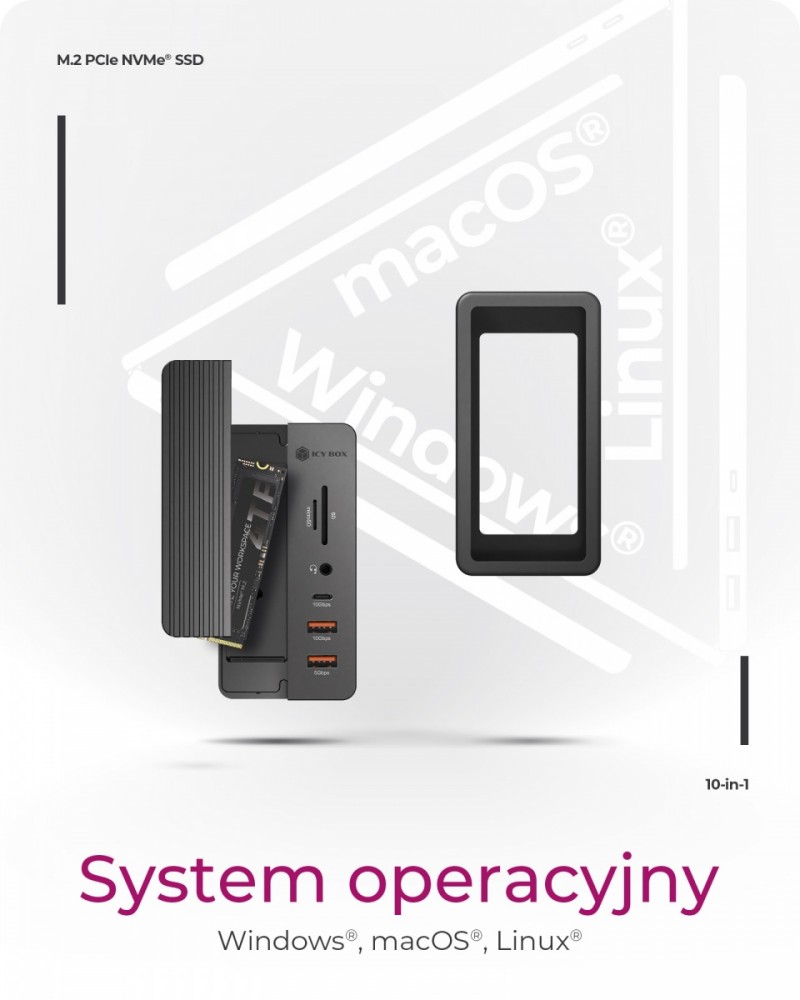 Beznarzędziowa instalacja M.2 SSD - Zintegrowana obudowa M.2 NVMe SSD, obsługująca PCIe Gen3x2 dla szybkiego transferu danych. Beznarzędziowa konstrukcja pozwala na szybką instalację lub wymianę dysku SSD. Dzięki obsłudze wielu rozmiarów dysków SSD 22x 30/42/60/80, obudowa ta stanowi praktyczne i szybkie rozwiązanie do rozbudowy pamięci masowej. Łączność USB - jedno złącze USB Type-C (10 Gbit/s), jedno złącze USB Type-A (10 Gbit/s) i jedno złącze USB Type-A (5 Gbit/s). Czytnik kart SD/microSD do wygodnego dostępu do plików, port Gigabit Ethernet do stabilnej pracy w sieci oraz gniazdo audio 3,5 mm do podłączenia słuchawek lub mikrofonu. HDMI Display - Wbudowany port HDMI zapewnia ostry i szczegółowy obraz w maksymalnej rozdzielczości 4K przy 60 Hz. Niezależnie od tego, czy potrzebujesz drugiego ekranu do pracy wielozadaniowej, rozszerzonego wyświetlacza do prezentacji, czy większego obszaru roboczego do kreatywnych projektów, ta stacja dokująca zapewnia wyjście wideo w wysokiej rozdzielczości. Power Delivery 3.0 - Zapewnia zasilanie przez cały dzień dzięki portowi USB Type-C PD-IN, który obsługuje dostarczanie do 100 watów mocy. Wystarczy podłączyć zasilacz USB Type-C, aby naładować DockingStation i podłączone urządzenia bez konieczności stosowania dodatkowych adapterów lub zaśmiecania przestrzeni roboczej. Konstrukcja ochronna - Aby chronić obudowę przed uderzeniami i zadrapaniami, to DockingStation jest dostarczane z dopasowanym gumowym rękawem. Stanowi ona dodatkową warstwę ochronną podczas transportu lub codziennego użytkowania, pomagając utrzymać urządzenie w czystości i nienaruszonym stanie, niezależnie od tego, czy znajduje się na biurku, czy w torbie. System operacyjny - niezależnie od tego, czy pracujesz w systemie Windows, macOS czy Linux, ta stacja dokująca pasuje do istniejącej konfiguracji. Została zaprojektowana do pracy z szeroką gamą urządzeń i środowisk systemowych, dzięki czemu można przełączać się między stacjami roboczymi bez martwienia się o kompatybilność lub potrzebę posiadania oddzielnych akcesoriów dla każdego systemu.