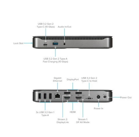Ta mała, ale potężna stacja dokująca jest również wyposażona w dodatkowe porty, które utrzymują Cię w kontakcie i pozwalają na porządek w przestrzeni roboczej. Od USB-C po USB-A, porty audio i Ethernet masz to wszystko. A to wszystko w kompaktowej i niskoprofilowej obudowie.