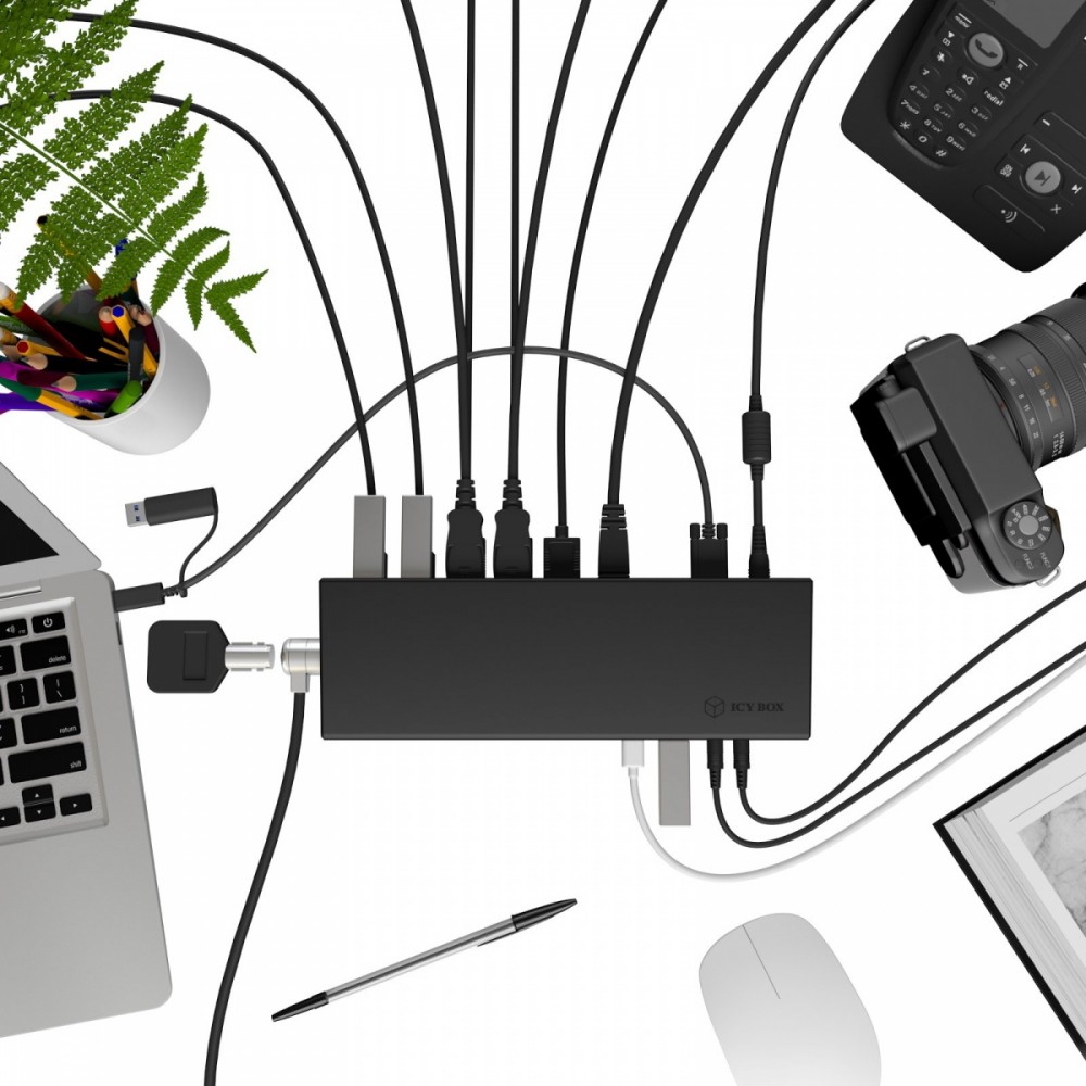 14 w 1 Stacja dokująca USB 3.0 Type-A + Type-C z PD 60W IB-DK2244AC UWAGA: Przed użyciem należy zainstalować sterownik DisplayLink. Rozszerzenie wyświetlacza i portu zapewnia technologia kompresji wideo DisplayLink Power Delivery: dzięki Power Delivery (60 W) możliwe jest ładowanie komputera hosta w ruchu, o ile zewnętrzny zasilacz jest podłączony do stacji dokującej. Oszczędza to miejsce, ponieważ wystarczy zabrać ze sobą tylko jeden zasilacz Rozdzielczość wideo: dwa interfejsy HDMI i DisplayPort obsługują rozdzielczość do 4096 x 2160 @ 60 Hz. Kolejny interfejs HDMI osiąga rozdzielczość do 3840 x 2160 przy 30 Hz. Przy użyciu dwóch kabli DisplayPort można uzyskać rozdzielczość do 5120 x 2880 @ 60 Hz USB: Stacja dokująca ma z przodu porty USB typu A i typu C, które umożliwiają transfer do 5 Gb/s. Z tyłu dostępne są również cztery porty typu A Audio: ze względu na eliminację wejść i wyjść audio w nowszych laptopach zazwyczaj nie ma już możliwości podłączenia słuchawek przewodowych. Istniejące wejście audio i mikrofonowe przeciwdziała temu problemowi