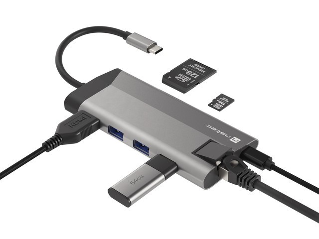 Natec Fowler Plus to niewielki multiport, który rozwiąże Twoje problemy i pozwoli Ci podłączyć co tylko zechcesz. Wyposażono go w aż 8 portów, pośród których znajdziesz 3 gniazda USB 3.0 typu A, port HDMI 1.4 wspierający rozdzielczość 4K, dwa czytniki kart (SD i microSD) a nawet gniazdo RJ-45 (1 Gb/s) i USB-C obsługujące standard ładowania Power Delivery 3.0. Korzystanie z akcesoriów jeszcze nigdy nie było tak wygodne.