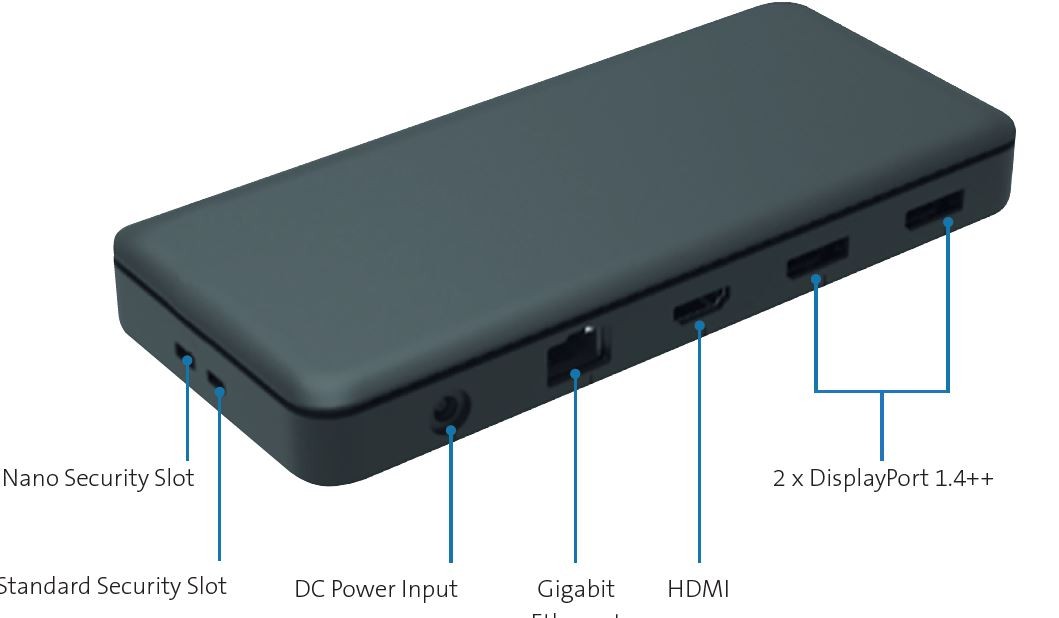 Z przodu znajduje się 1 port USB-C 3.2 Gen2 (do 5 V/1,5 A/10 Gb/s), 3 porty USB-A 3.2 Gen2 (do 5 V/0,9 A/10 Gb/s) oraz port combo audio. Z tyłu znajduje się port Gigabit Ethernet, 2 porty DP++ 1.4 i jeden port HDMI 2.0.